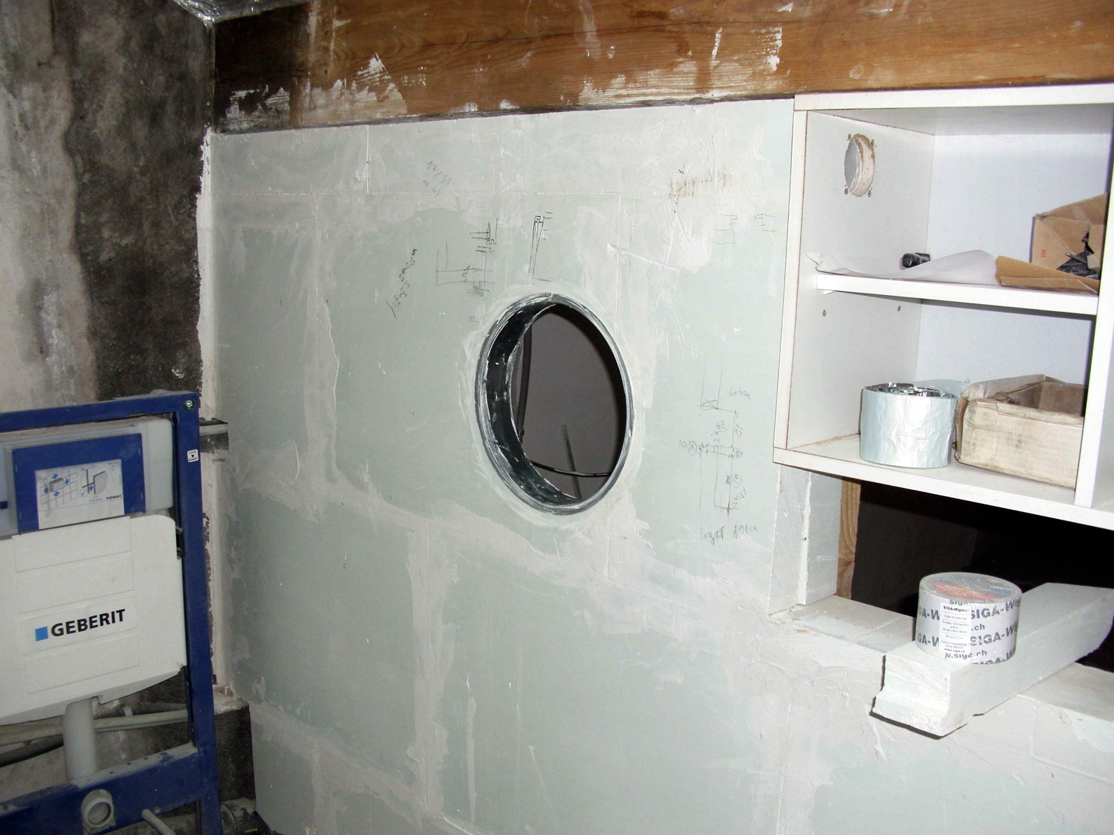 Avril 2010. Doublage du mur du fond au niveau du cadre des WC suspendus.
